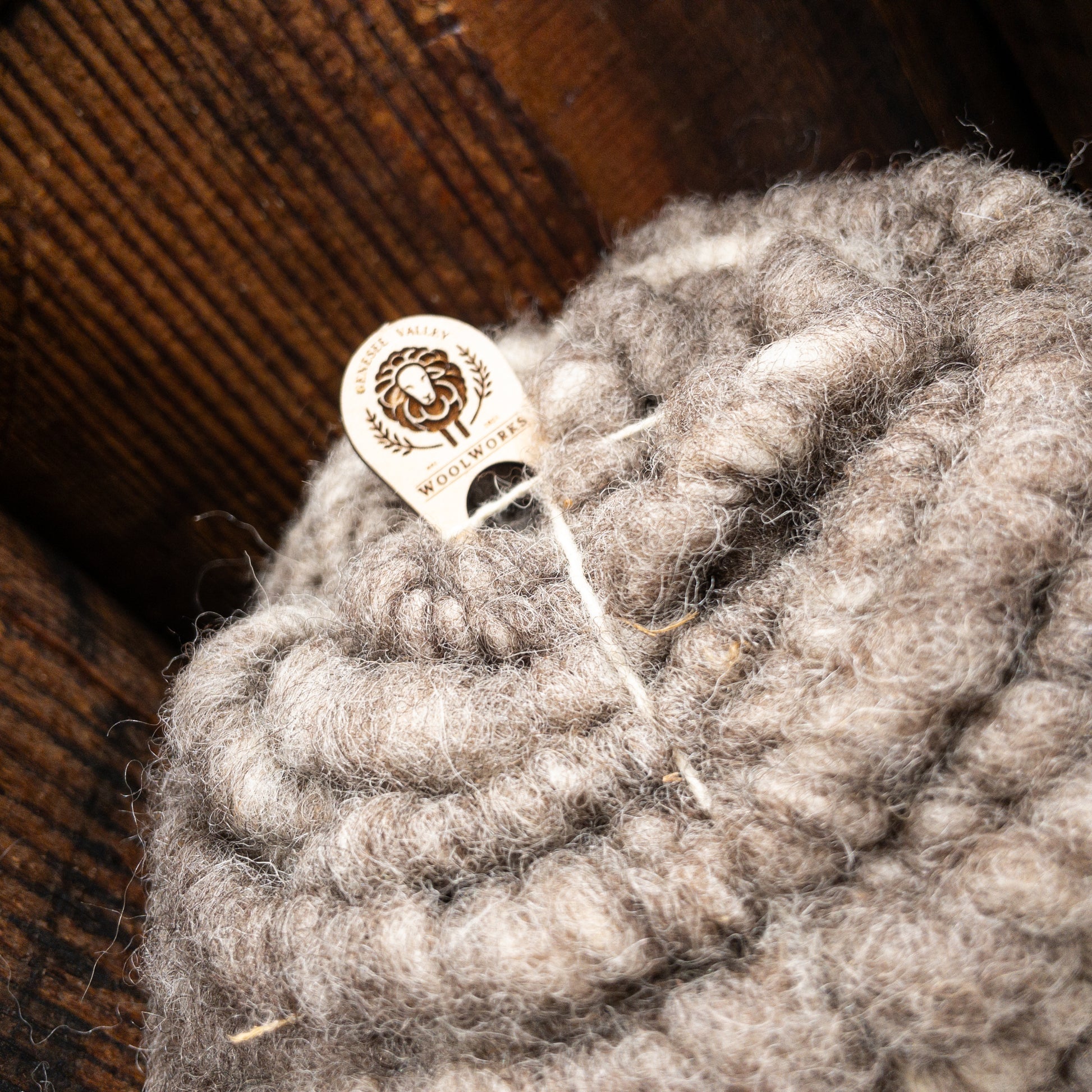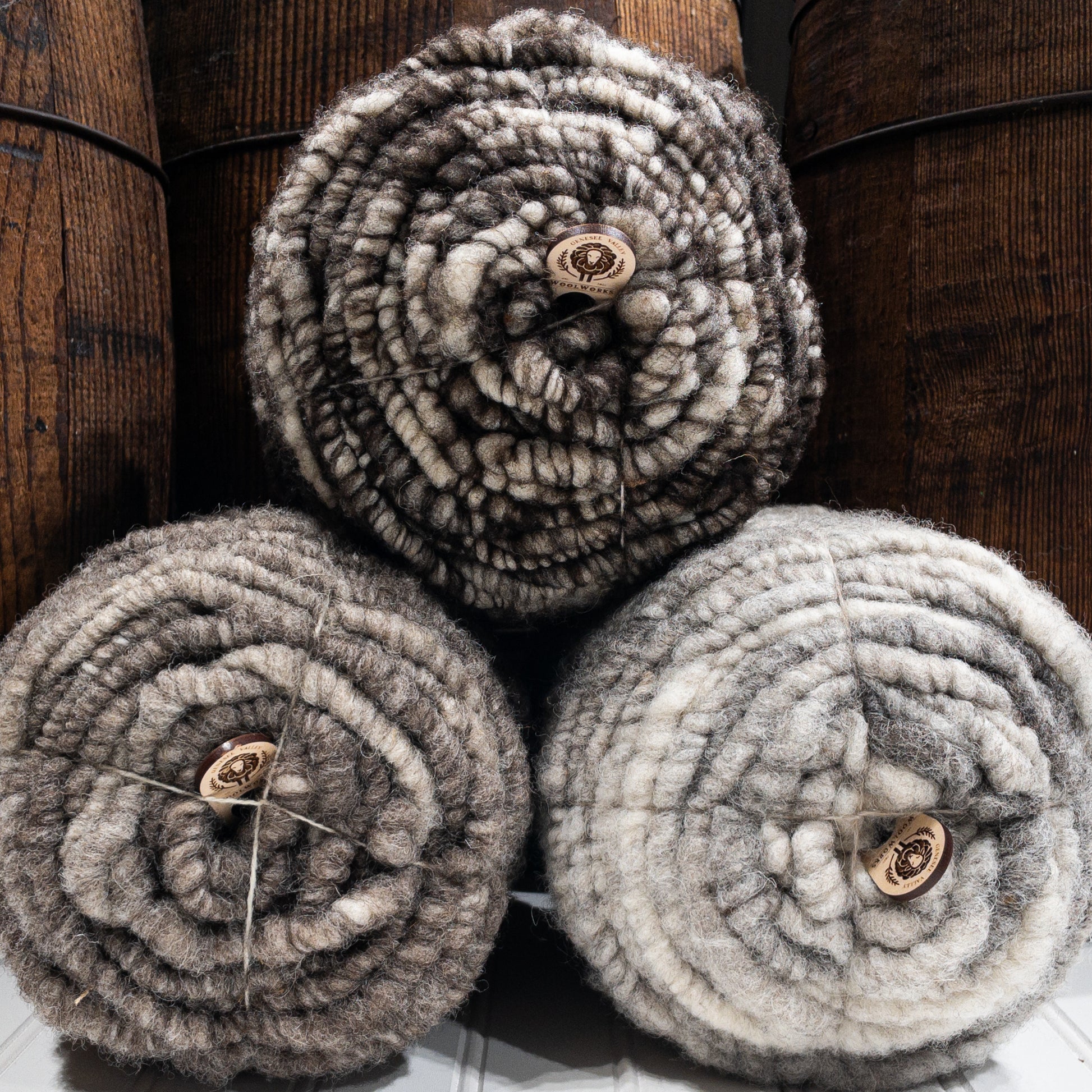Our overlay rug yarn is thick, strong, and ready for work. Each bump weighs approximately 30 ounces and measures about 100 yards in length, with an average diameter of 3/8". It’s spun around a durable wool core using 100% wool fiber for both structure and softness.